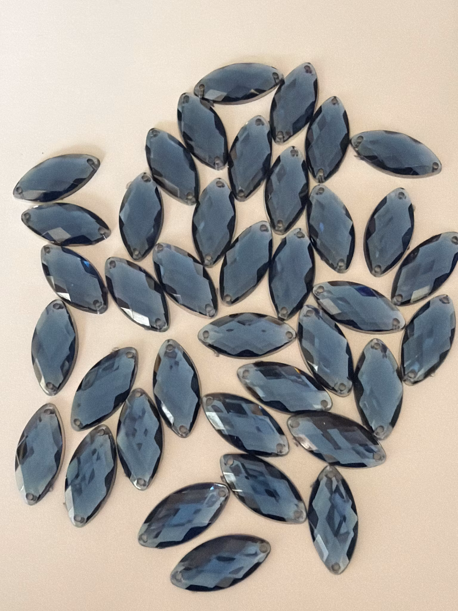 Navette i akrylplast. Fasetterad med platt baksida. Perfekt till kostymer/dräkter/kläder där man vill minska vikten av att använda glas stenar.